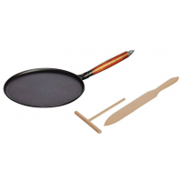 Die schwarze Crêpes Pfanne von der renommierten Firma STAUB® aus Frankreich macht es Ihnen leicht, leckere Cr'epes im Handumdrehen zu backen. Sie besitzt einen sehr niedrigen Rand, sodass Sie dünne Pfannkuchen oder Crêpes leicht wenden können. Ein weiterer Vorteil dieser Pfanne ist die Tatsache, dass Sie aus Gusseisen besteht. Kein Material brät so kross! Dieses Material leitet die Hitze optimal und verteilt sie über den gesamten Pfannenboden bis zum Rand. So werden die Speisen an allen Stellen gleichmässig gegart.