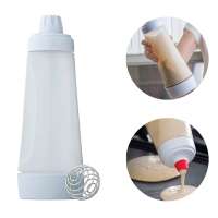 Füllen Sie die Lebensmittel aus Ihrem Teig in das Innere, indem Sie den Behälter umdrehen, um die größere Öffnung zu nutzen. Der Deckel dient Ihnen dann als Basis, um die Flasche stabil zu halten. Rühren Sie dann durch Schütteln um, wobei die Edelstahlkugel dafür sorgt, dass sich die Klumpen auflösen.